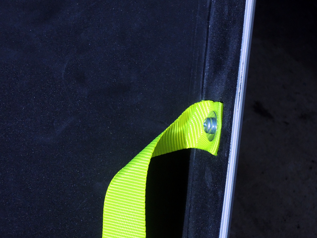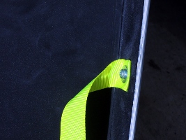 ケース側面に穴を開け百均で買ってきた荷締めベルトの切れっ端を固定する。