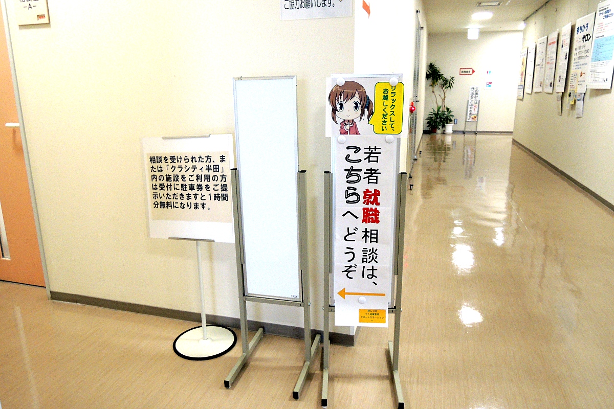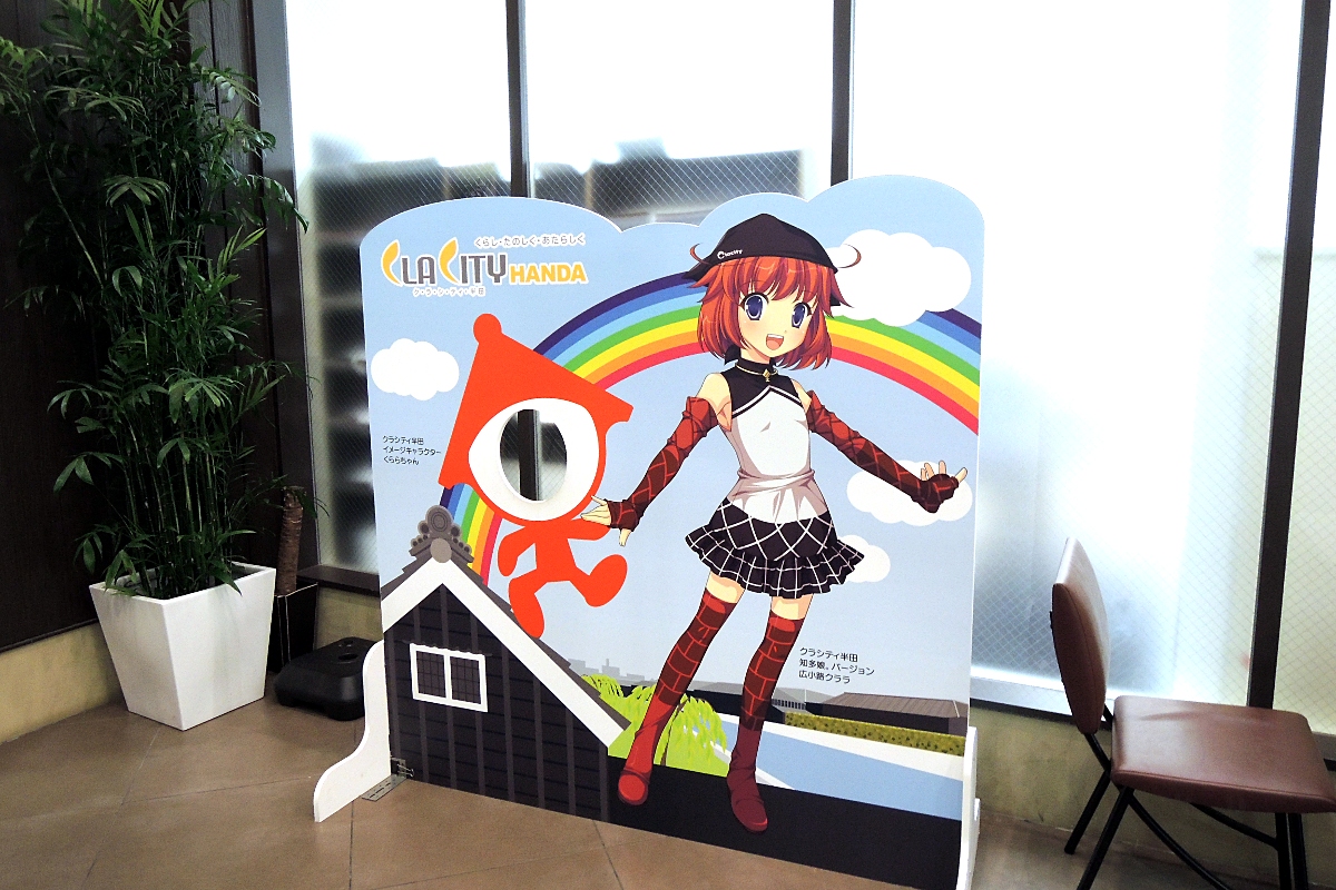 1 階の休憩所付近にクラシティのマスコットの広小路クララちゃんのタテカン。