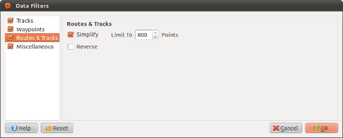 Data Filters ダイアログの Routes & Tracks の Simplify Limit To に減らしたポイント数を指定する。